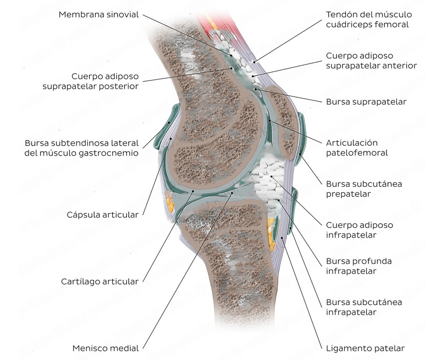 - Tejidos blandos: Comprenden los ligamentos, tendones y cartílagos, encargados de conferir estabilidad, flexibilidad y protección a las articulaciones.