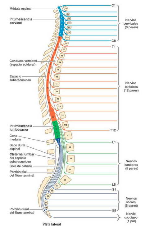 - Sacra (S1-S5, fusionadas): Forma el sacro, que conecta la columna con la pelvis y estabiliza la base del cuerpo.